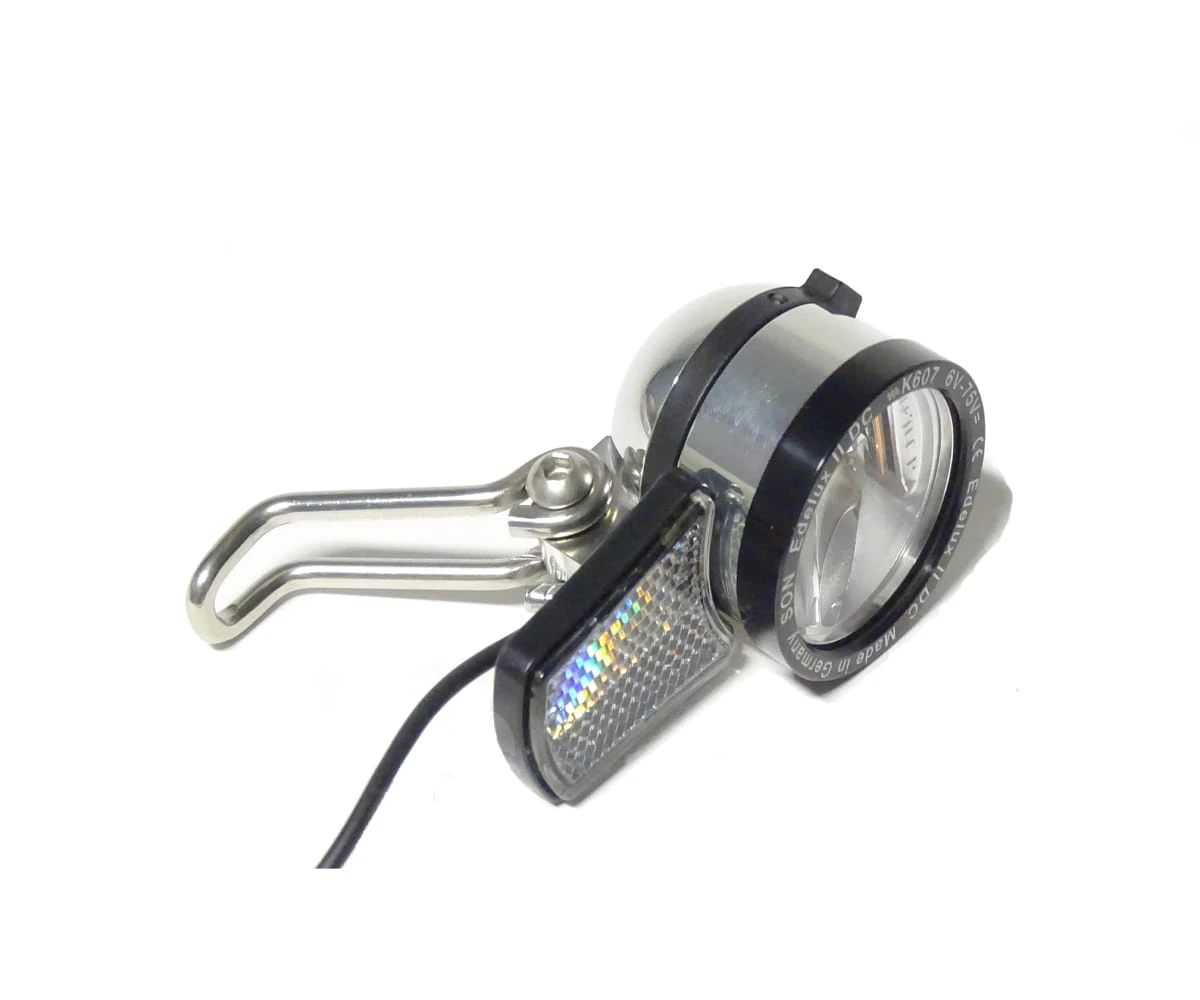 - Het inschakelen van koplamp en achterlicht gebeurt hier op het display van de aandrijving, daarom heeft de Edelux II DC 6 Volt geen schakelaar en achterlicht uitgang