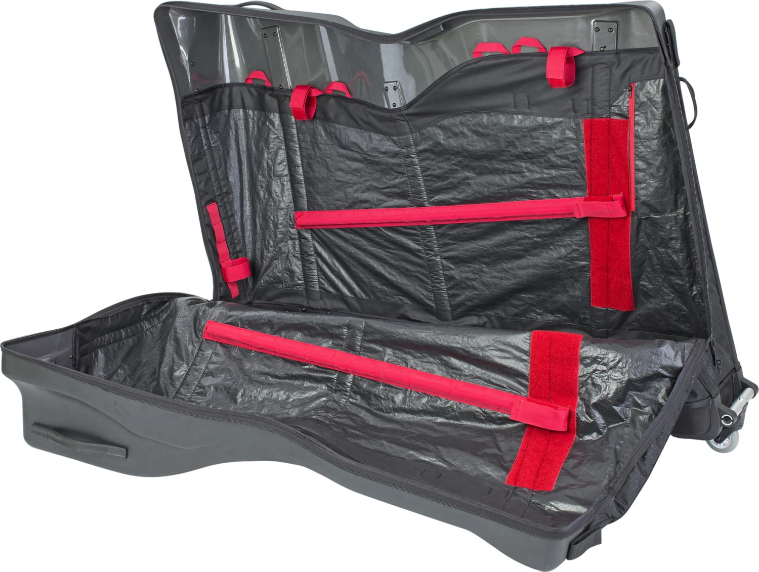 Fiets reistas met een hard-shell hybride constructie die op maat gemaakte race- en triatlonfietsen past zonder dat de cockpit of het zadel aangepast hoeft te worden.
