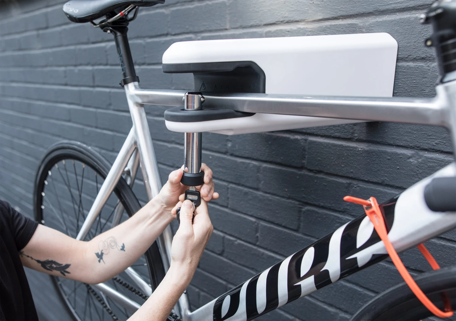 De nieuwe Airlok van Hiplok is een elegante en zeer veilige oplossing om je fiets aan de muur te bevestigen. Het ontwerp heeft een driehoekige vorm, met een veilige bevestigingsmogelijkheid, een frame van gehard staal en een afsluitbare veiligheidsgrendel. Bescherming tegen krassen op het frame en extra stabiliteit wordt geboden door de met rubber beklede coating. De Airlok is ideaal voor het stallen en beveiligen van de fiets in de garage of kelder.