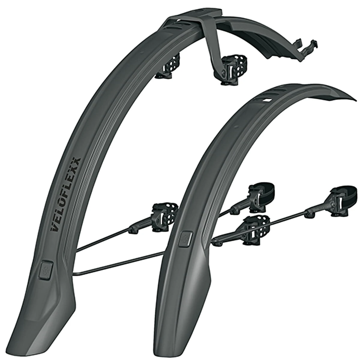 Het VeloFlexx spatbord – set combineert de stabiliteit van een vast gemonteerd spatbord met de flexibiliteit van een insteekbaar wielspatbord. Aangezien de VeloFlexx continue wielbescherming biedt, is hij alleen compatibel met schijfremmen. Met de VeloFlexx-brug kan het achterspatbord zonder gereedschap aan de bovenkant van de staande achtervork worden bevestigd met behulp van rubberen riemen. Deze montageoplossing is niet langer afhankelijk van de dwarsbeugel waaraan de remklauw van de velgrem gewoonlijk wordt bevestigd. Aan de voorkant wordt de VeloFlexx met een rubberen klittenband of kabelbinder aan de drievoudige klem bevestigd. De frame-adapters maken het mogelijk hem op elke vork te monteren en zijn tevens in hoek verstelbaar. De zwart gecoate stangen zorgen voor nog meer houvast.
